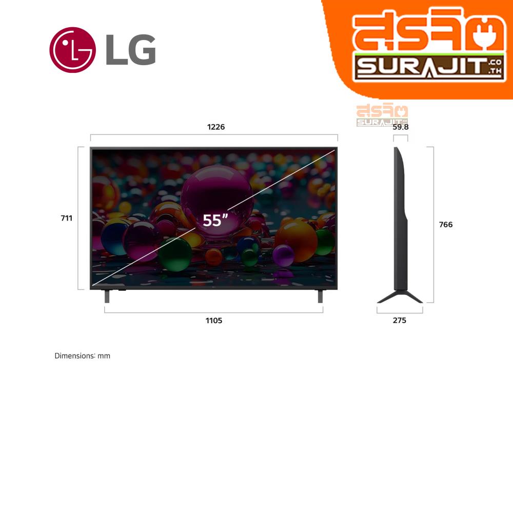 แอลอีดีทีวี 55 นิ้ว Smart TV 4Kแอลอีดีทีวี 55 นิ้ว Smart TV 4KActive HDR รองรับภาพ HDR 10 Pro และ HLG α7 AI Processor 4K Gen 8 ชิปประมวลผลยกระดับภาพ 4K 4K Super Upscaling ยกระดับความคมชัดของภาพ 4K webOS 25 สมาร์ททีวีใช้งานง่ายมี AI ที่เข้าใจคุณ AI Magic Remote รีโมทใช้สะดวกเสมือนเม้าส์ไร้สาย การเชื่อมต่อ 3 x HDMI,1 x USB,Wi-Fi 5 Bluetooth 5.0