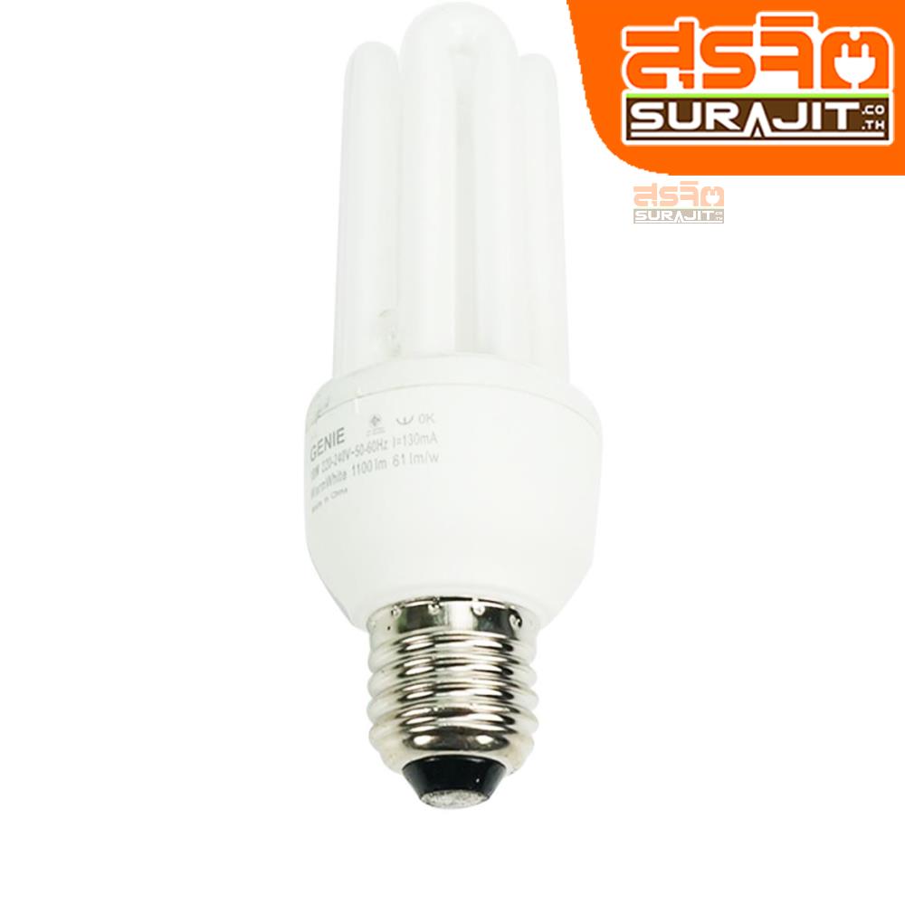 หลอดจีนี 18W E27 แสงแดงหลอดจีนี 18W แสงวอร์มไวท์ (เทียบเท่าหลอดไส้ 100 วัตต์)ใช้ขั้วไฟขนาด ขั้ว E27 จุดติดทันที ไม่กระพริบ เพราะมีบัลลาสต์ในตัว ประหยัดไฟได้ถึง 80% ขนาดหลอด 48*133 มิลลิเมตร อุณหภูมิสี 2,700 K ความสว่าง 1,100 ลูเมน อายุการใช้งาน 8,000 ชม. มอก.1955-2551 กล่อง กว้าง x ลึก x สูง 5.5x5x14 ซม., 0.103 กก.